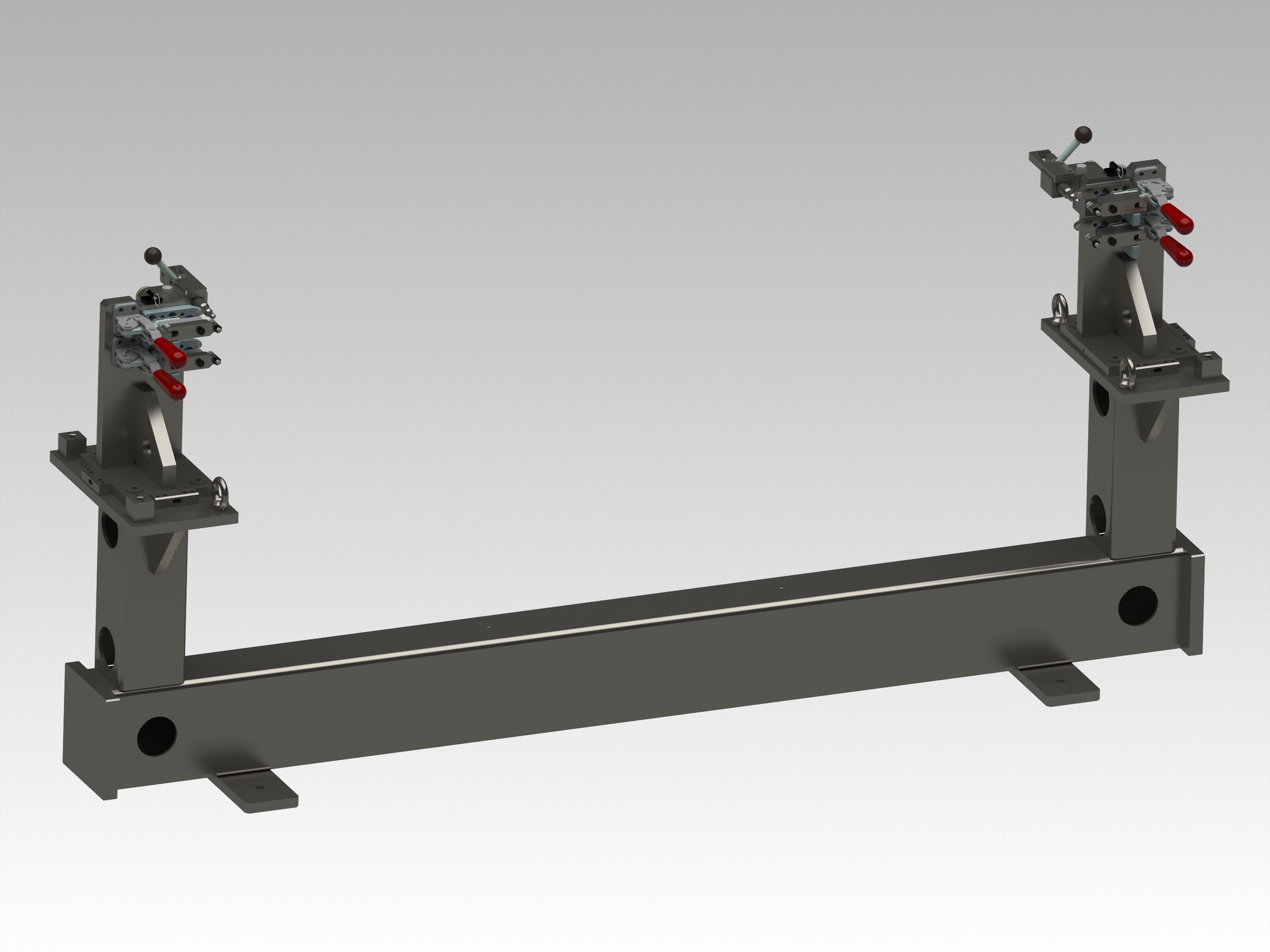 This fixture is used to hold a CCB(Cross car beam) part in CMM(Coordinate measuring machine). It is a manual fixture. There are 4 clamping points and 2 retractable locating pins. When the part is loaded to the fixture by the operator, clamps are closed one by one according to customer specific clamping sequence by the operator. After all clamps are closed, pins are retracted from the part. The pin assembly is also rotated away to be able to get better access for the measurement of the alignment holes.