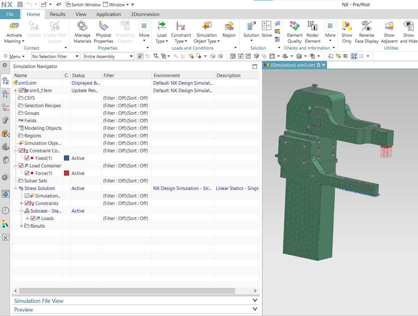 In NX, firstly we import the CAD model and then we set the parameters. We enter the material as steel, add the the reaction force and a fix constraint at mounting surface as seen in the image.